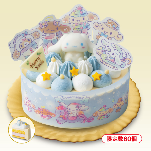 チーズムースの土台に雲をイメージしたシナモロールカラーのクリームを絞ったかわいらしいケーキ