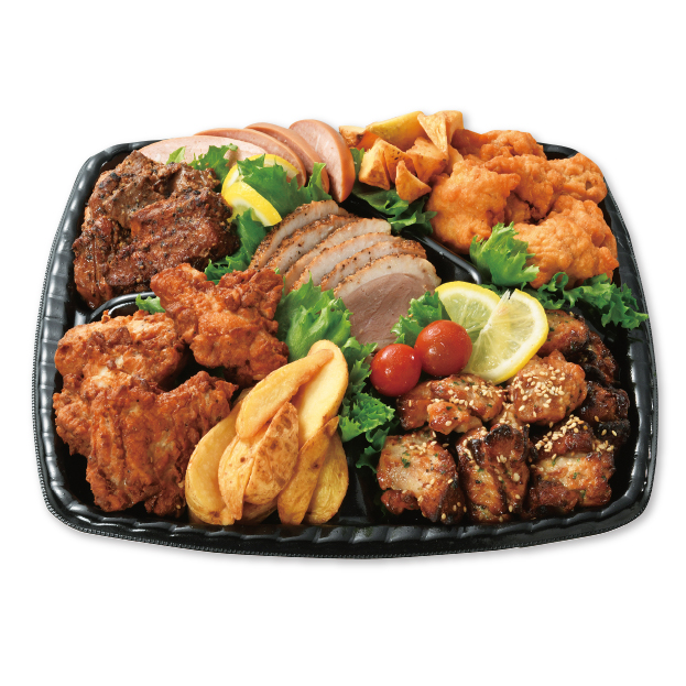 合鴨黒胡椒焼き、骨無しスペアリブなどの人気のお肉惣菜と、定番の唐揚げ、ポテトフライを盛合せました。