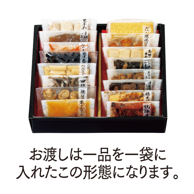 ■お渡しは一品を一袋に入れた形態になります。※重箱、飾り物はついておりません。