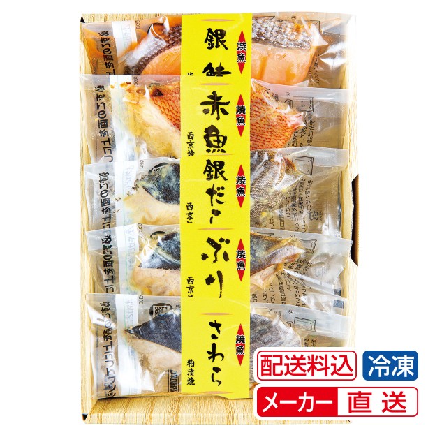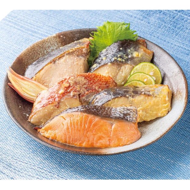 ■銀鮭塩焼(チリ産)、赤魚西京焼(アメリカ産)、銀だら西京焼(アメリカ産)、ぶり西京焼(国内産)、さわら粕漬焼(韓国産)各50gx1切