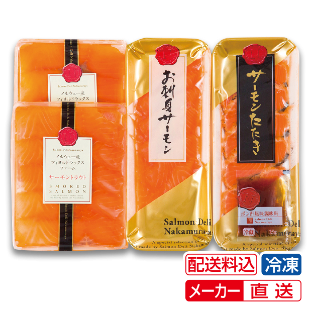 ■スモークサーモン(トラウト)50g入x2パック(ノルウェー産)、サーモンたたき(トラウト)80g(ノルウェー産)、お刺身サーモン(トラウト)80g(ノルウェー産)、ポン酢風味調味料15g