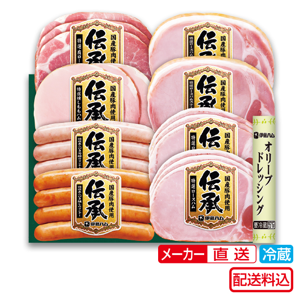 ■特選ロースハム45g入×2コ、特選肩ロース66g入、特選燻しももハム48g入、特選ロースハムステーキ70g入×2コ、特選あらびき燻しウインナー85g入、特選あらびき芳醇ウインナー85g入、オリーブドレッシング60ml