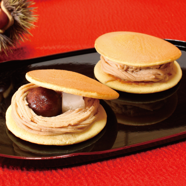 ふんわりとした風味豊かな生地にモンブランあんと渋皮付き一粒栗・求肥餅を挟みこみました。