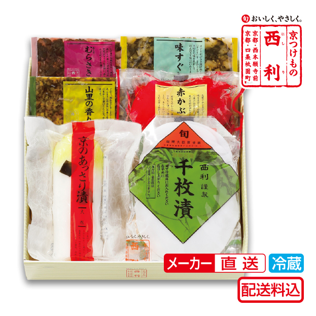 ■千枚漬70g、大根あっさり漬1/4割、赤かぶら80g、赤しそむらさきの50g、山里の香り40g、味すぐき40g