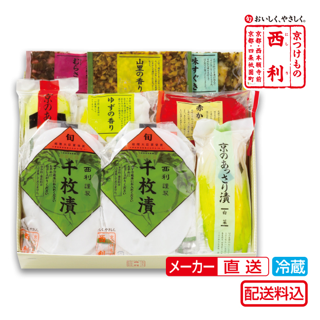 ■千枚漬70g×2、大根あっさり漬1/4割、白菜あっさり漬223g、赤かぶら80g、赤しそむらさきの50g、味すぐき40g、山里の香り40g、ゆずの香り50g