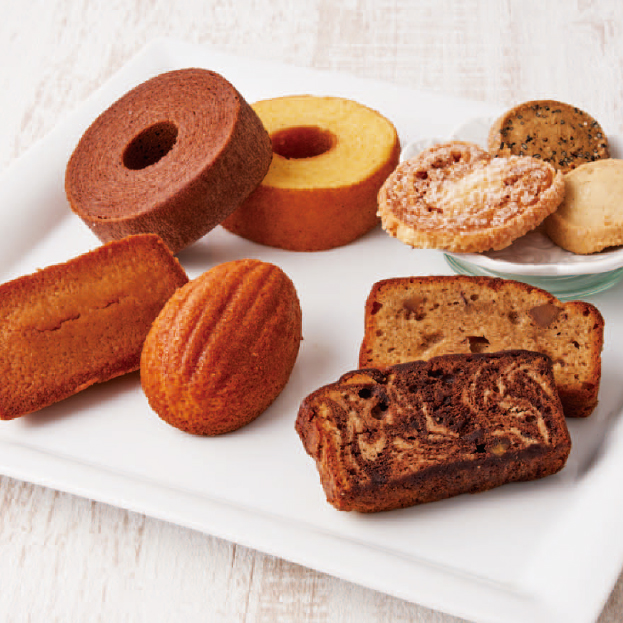 ■フィナンシェ、はちみつマドレーヌ、マーブルケーク、マロンケーク、パルミエ・バームクーヘン(プレーン・ショコラ)×各2、クッキー(黒胡麻と黒糖・バニラ)×各5