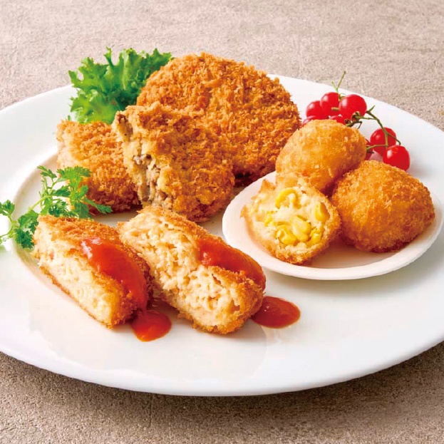 とうもろこしの自然な甘み、蟹の美味しさをギュッと濃縮したベシャメルソースの蟹クリームコロッケ、牛肉の旨みがあふれるビーフコロッケの3 種セットです。