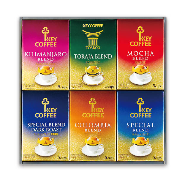 ■〈ドリップオン〉トラジャブレンド、スペシャルブレンド、モカブレンド、キリマンジャロブレンド、コロンビアブレンド各1箱(各8g×5袋)、スペシャルブレンド深煎り1箱(7.5g×5袋)