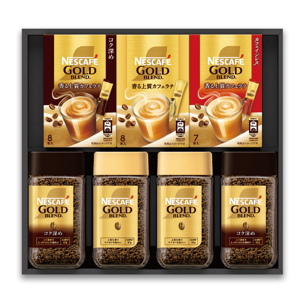■〈ネスカフェゴールドブレンド〉オリジナルブレンド、コク深め 各80g×各2、〈ネスカフェゴールドブレンドスティック〉オリジナル7gx8、コク深め7gx8、カフェインレス7gx7×各1箱
