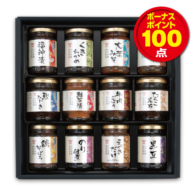 ■福神漬90g、くきわかめ75g、大葉みそ100g、鯛みそ100g、鰹ひじき40g、鮭茶漬60g、牛肉ごぼう55g、たらこ昆布50g、鶏そぼろ50g、のり佃煮95g、えのきだけ90g、黒豆100g