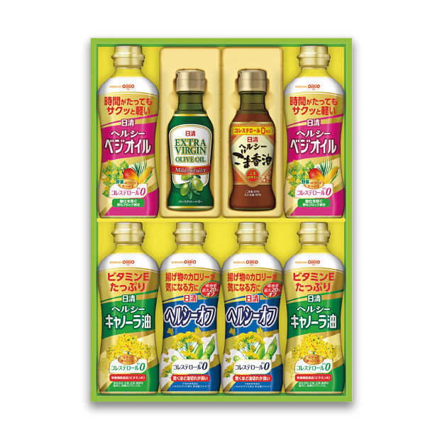 日清エキストラバージンオリーブオイルを中心にバラエティ豊かな食用油を詰め合わせたギフトです。