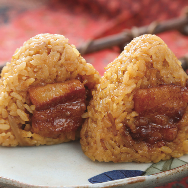 角煮きざみ、牛蒡を加え、角煮の旨味が溶け出したたれをまぶし、とろとろの角煮をのせたおにぎりです。