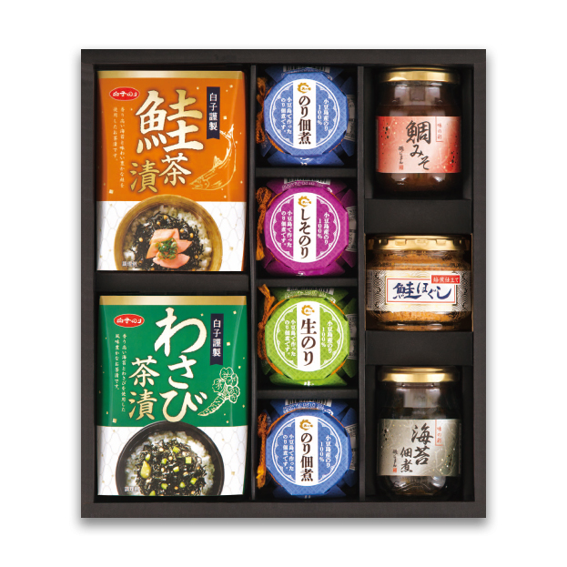 ■磯じまん(鯛みそ100g・海苔佃煮90g)、小豆島産佃煮(のり×2・生のり・しそのり)各80g、鮭ほぐし40g、白子のり(鮭茶漬3.8g・わさび茶漬3.3g)各3袋