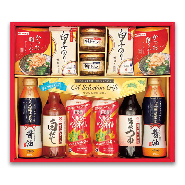 ■マルキン(旨味つゆ・白だし)各360ml、日清ヘルシーベジオイル350g×2、伊賀越天然醸造醤油450ml×2、白子味のり(8切5枚)×4、マルトモかつお削りぶし1.5g×4P×2、鮭ほぐし40g、鯖ほぐし40g