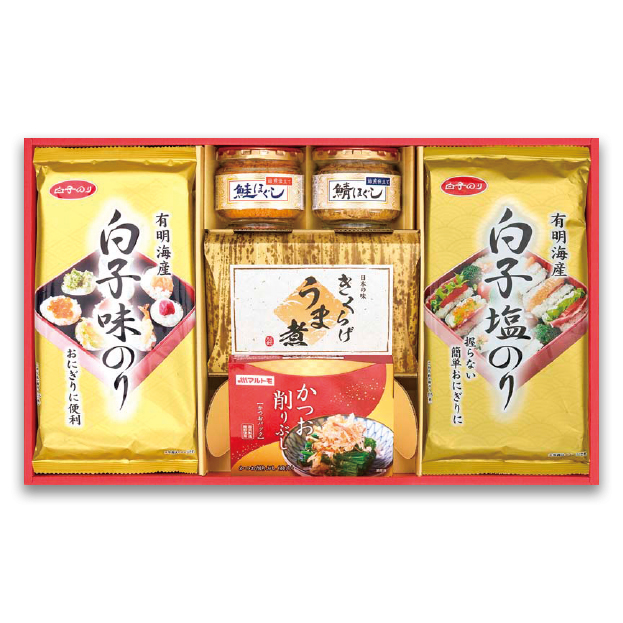 ■白子のり(味のり・塩のり)各2切5枚×各2、きくらげうま煮80g、マルトモかつお削りぶし1.5g×4袋、鮭ほぐし40g、鯖ほぐし40g