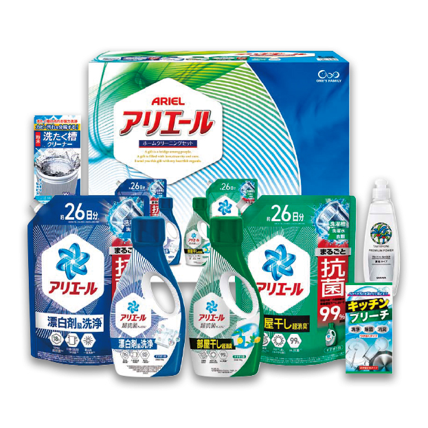 ■アリエールジェル(本体700g・詰替超特大625g)、アリエールジェル部屋干しプラス(本体700g・詰替超特大625g)、サラヤ食器用洗剤プレミアム200ml、洗たく槽クリーナー、キッチンブリーチ