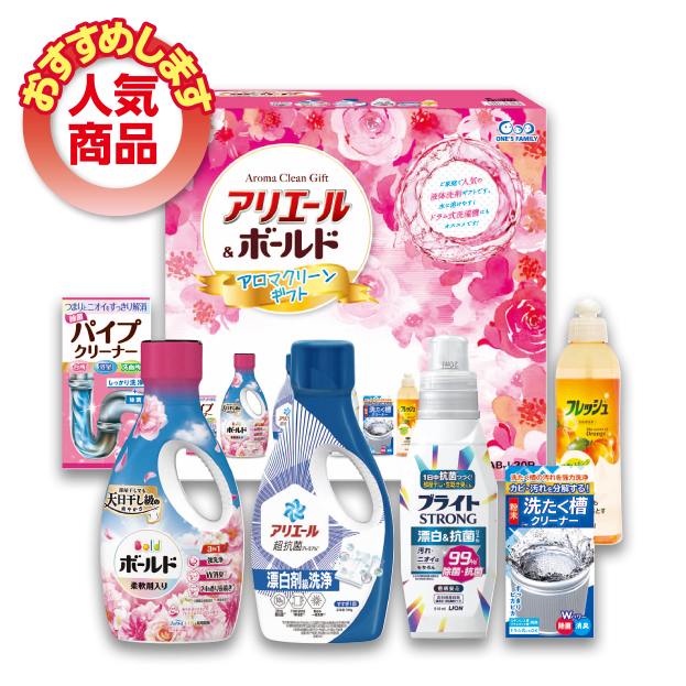 ■アリエールジェル本体700g、ボールドジェルプレミアムブロッサム本体680g、ブライトストロング510ml、食器用洗剤オレンジ250ml、パイプクリーナー、洗たく槽クリーナー